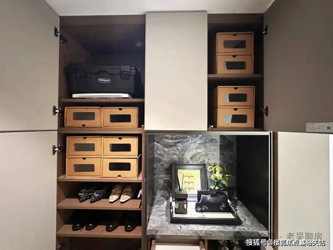 采用顶天立地高柜设计,嵌入电器的同时,通过透明密封罐统一收纳干货杂粮并贴标存放于拉篮内,容量充足可叠放约8个山姆款家庭装零食大礼包;并将备餐区下方的抽屉升级,
