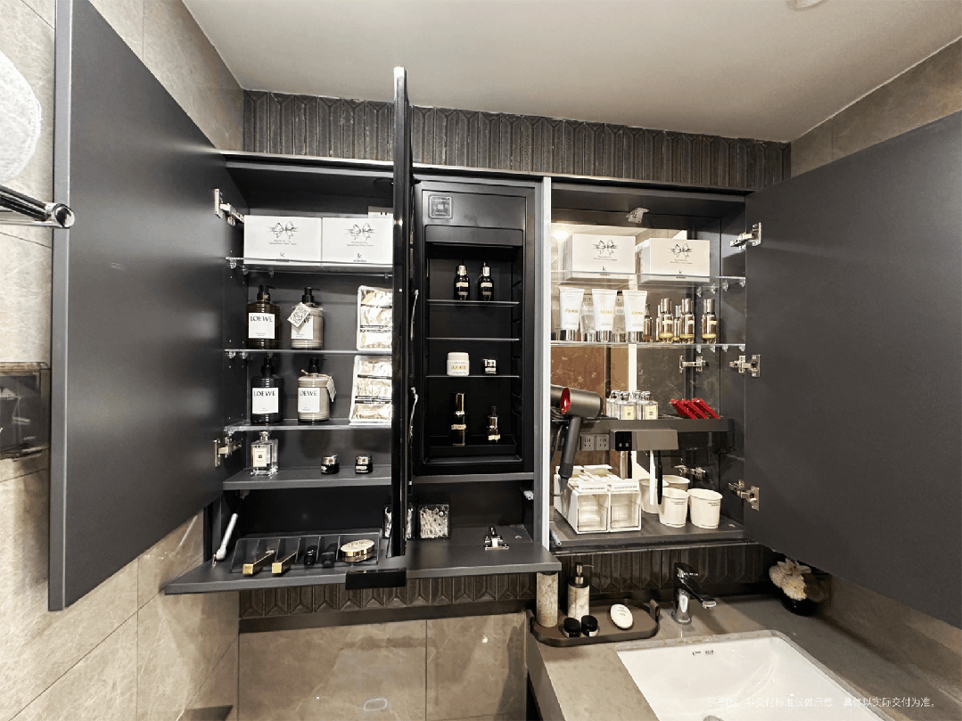 ,实现空间翻倍;主卫镜柜分层设计搭配分隔盒收纳护肤品,地柜采用抽屉式设计并内置防水收纳盒,分类存放清洁用品,细节满满。