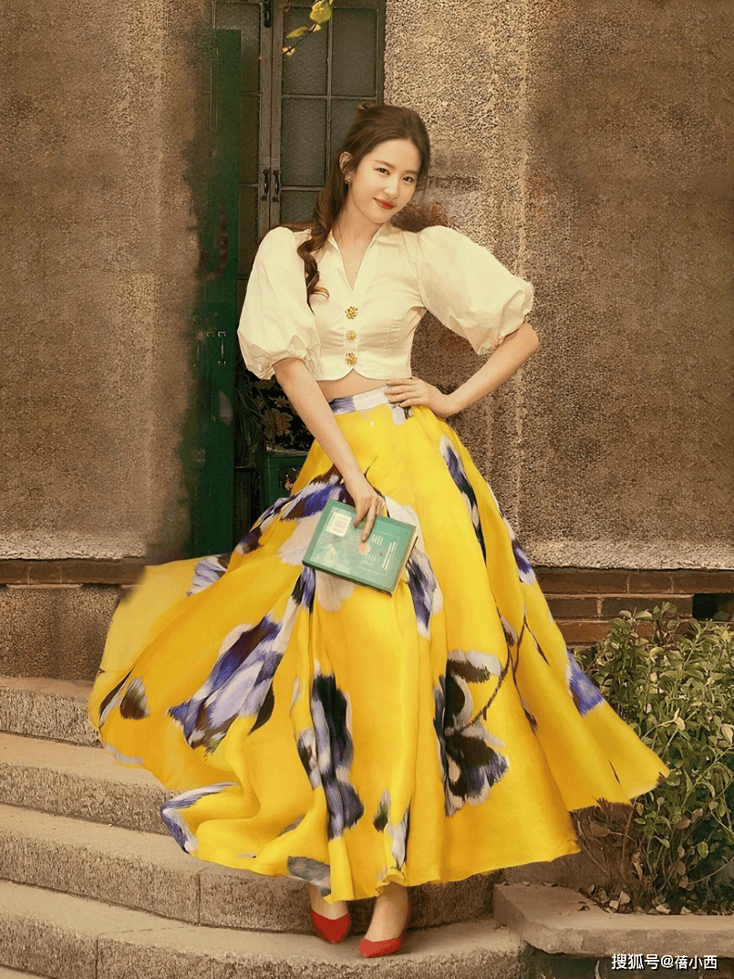 在剧中,刘亦菲的穿搭不仅限于简单的白色,她还大胆尝试了各种鲜艳的颜色。例如,她穿着一条明黄色的连衣裙,整个人显得非常明媚和充满少女感。即使已经36岁,依然看起来像个青春洋溢的年轻女孩!她身上的这款黄色宫廷风衬衫和半身裙也极具复古感,设计的泡泡袖和宽松的裙摆,展现了一种高贵典雅的气质,仿佛迪士尼公主一般,气场十足。